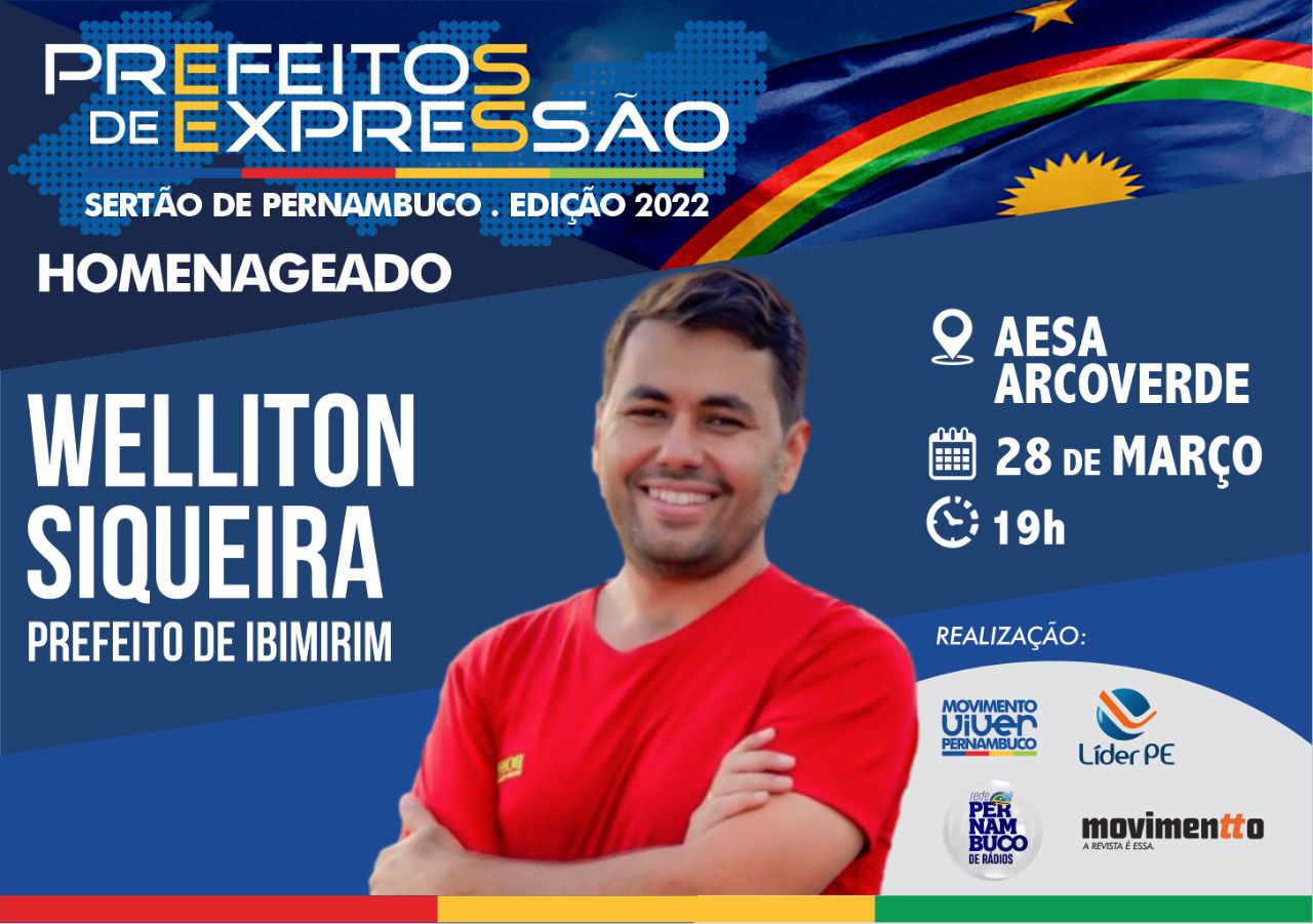 O prefeito de Ibimirim, Welliton Siqueira, será homenageado nesta segunda-feira(28.03.2022), em Arcoverde. O gestor está entre os 10 melhores prefeitos do sertão pernambucano.