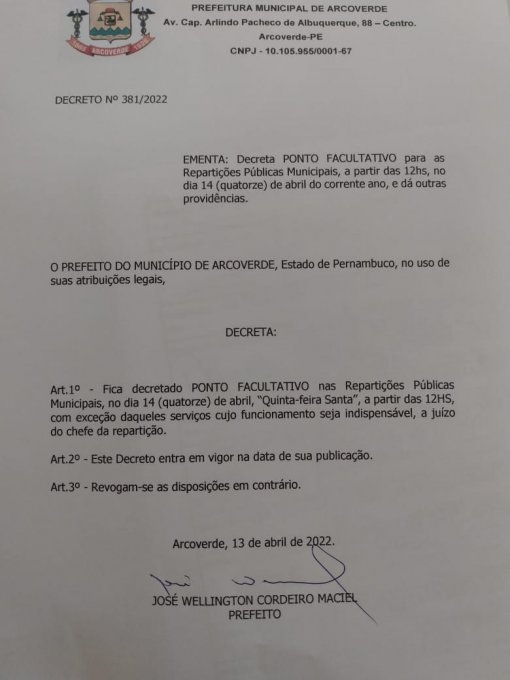 O Prefeito de Arcoverde, Wellington Maciel, no uso de suas atribuições legais, torna público o Decreto n° 381/2022, que consiste no ponto facultativo para as repartições públicas municipais, a partir das 12h deste dia 14 de abril de 2022 (Quinta-feira Santa).