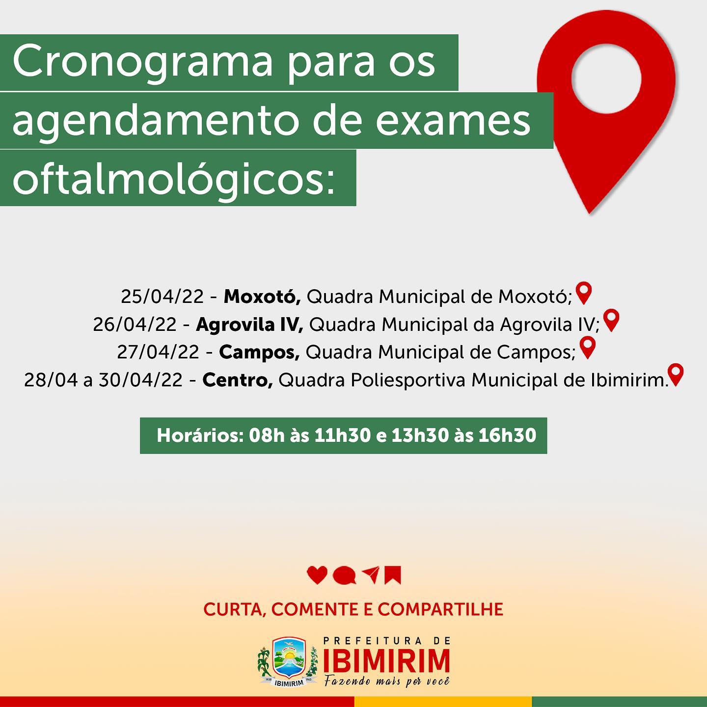 A prefeitura de Ibimirim anunciou o atendimento de oftalmologia no município, com exames de acuidade visual, pressão intraocular e o exame do olhinho, ainda neste mês de abril. De acordo com a Secretaria de Saúde, as consultas oftalmológicas gratuitas, vão atender aos moradores da cidade e da zona rural.