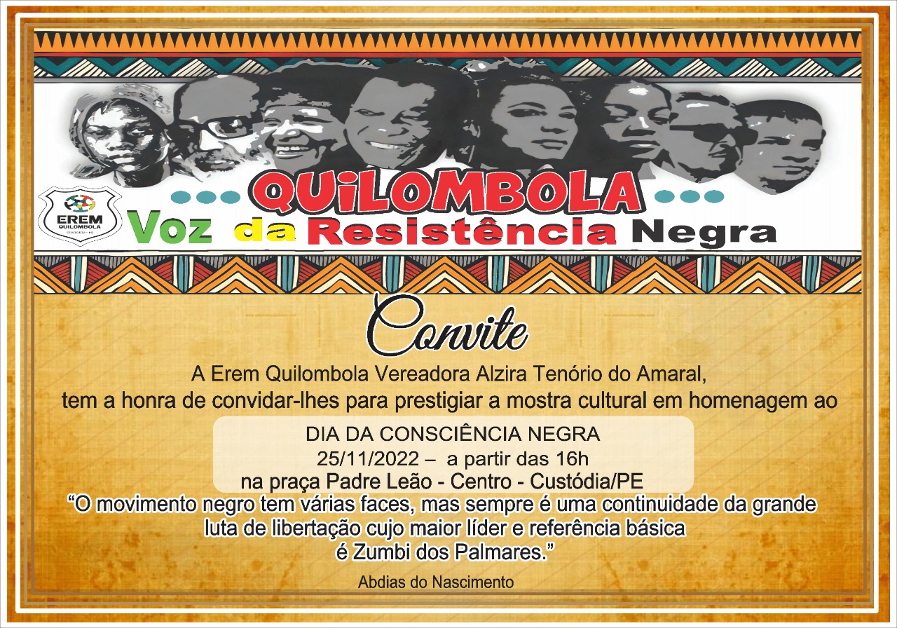 Com o tema “Quilombola Voz da resistência”, alunos e profissionais da EREM Quilombola vereadora Alzira Tenório do Amaral, no município de Custódia, realizam nesta sexta-feira (25.11.2022), uma grande mostra cultural para celebrar a Consciência negra.