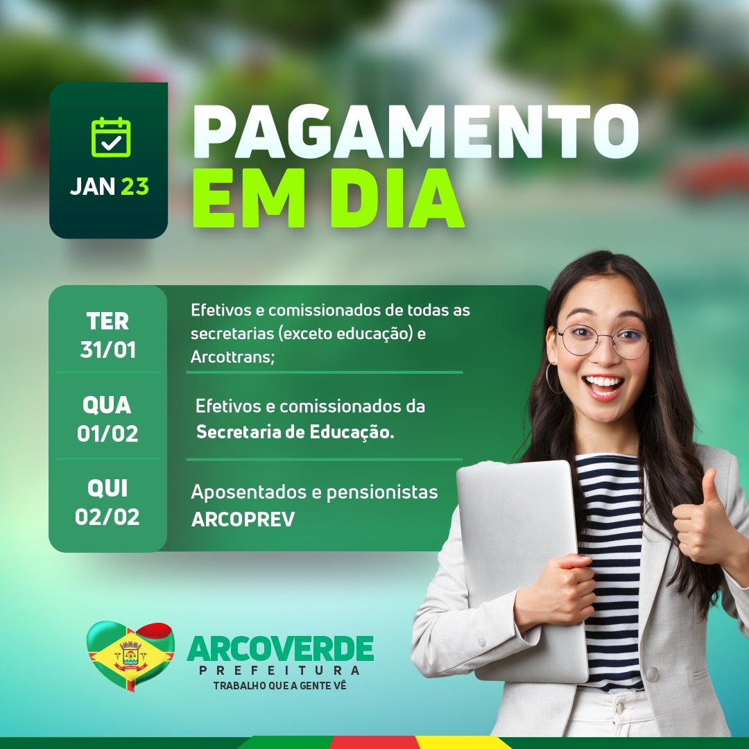 Os efetivos e comissionados das Secretarias da Prefeitura, Saúde, Assistência Social e Arcottrans terão os pagamentos liberados nesta terça-feira (31/01). Já para a Secretaria de Educação, a liberação acontece na quarta-feira (01/02). E para os aposentados e pensionistas da Arcoprev, na quinta-feira (02/02).
