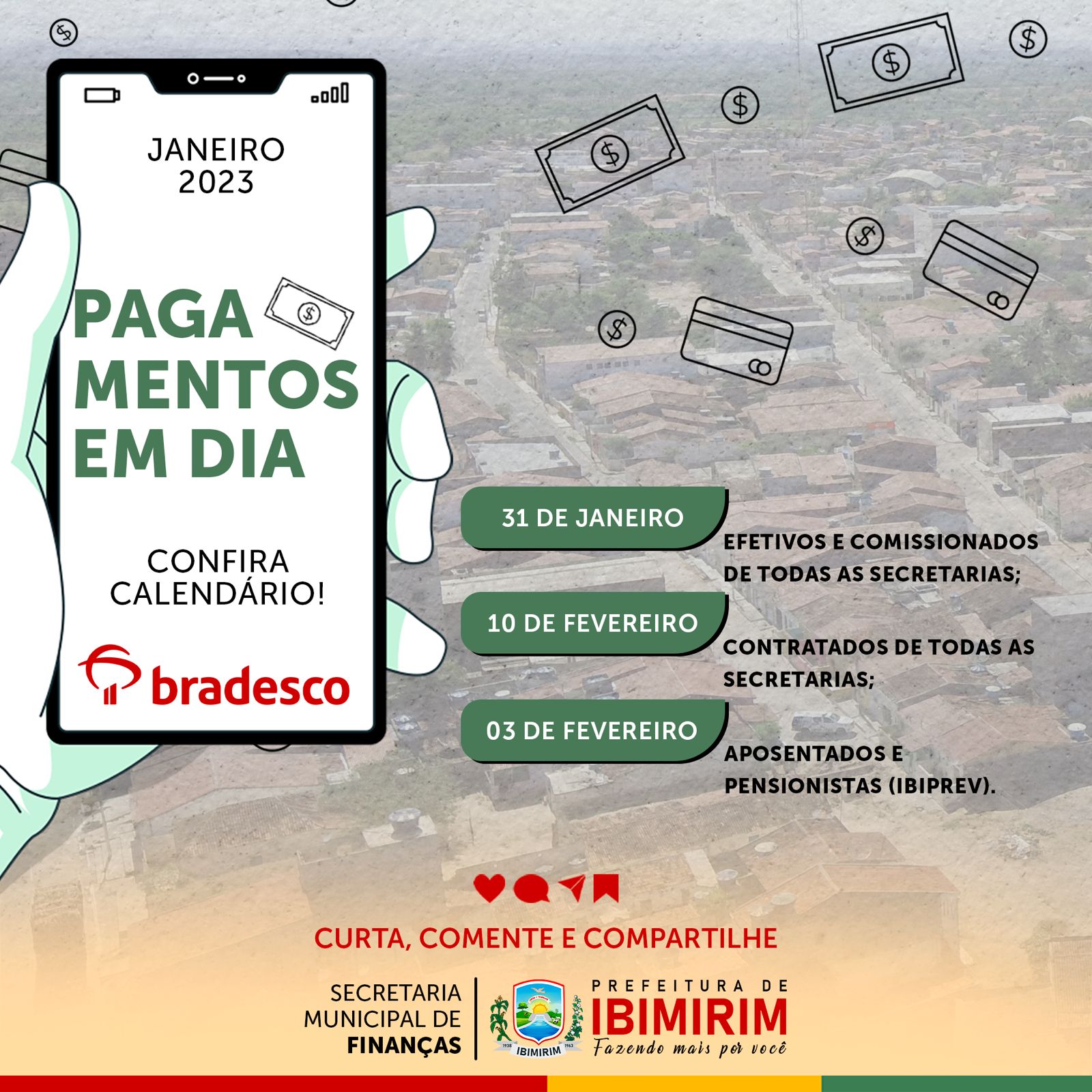 Já os aposentados e pensionistas do IBIPREV, receberão seus vencimentos na sexta-feira, dia três de fevereiro. O pagamento aos contratados de todas as secretarias municipais vai ser efetivado no dia 10.
