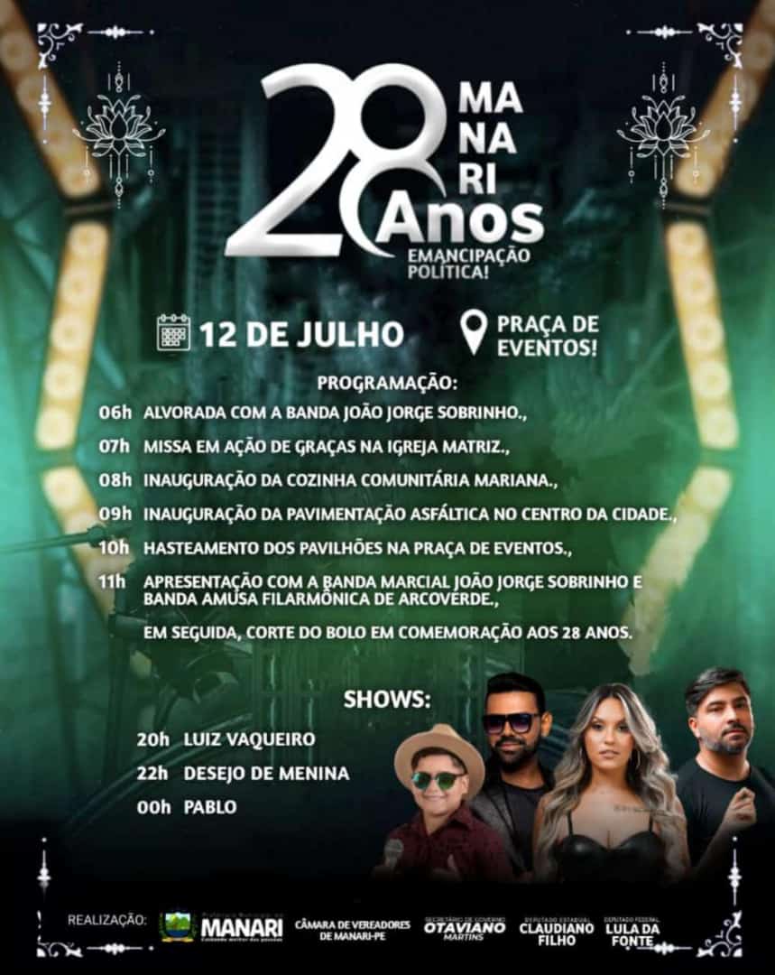aos 28 anos da emancipação de Manari acontece nesta quarta-feira(12.07.2023), e tem início às 6h, com Alvorada Festiva com a Banda João Jorge Sobrinho.