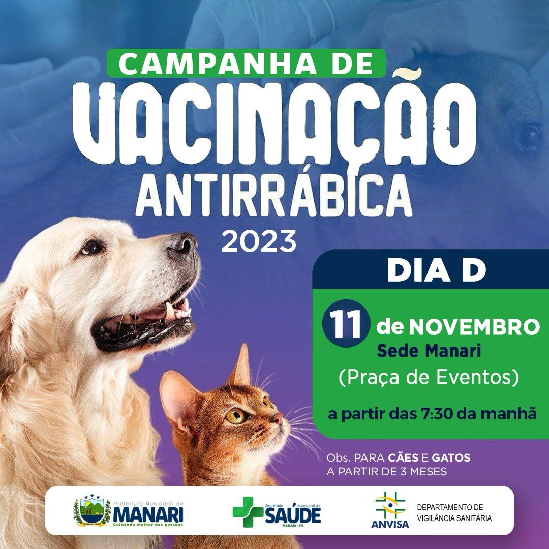 A Prefeitura de Manari através da Secretaria de Saúde e do Departamento de Vigilância Sanitária promove o Dia D de vacinação antirrábica para cães e gatos no município.