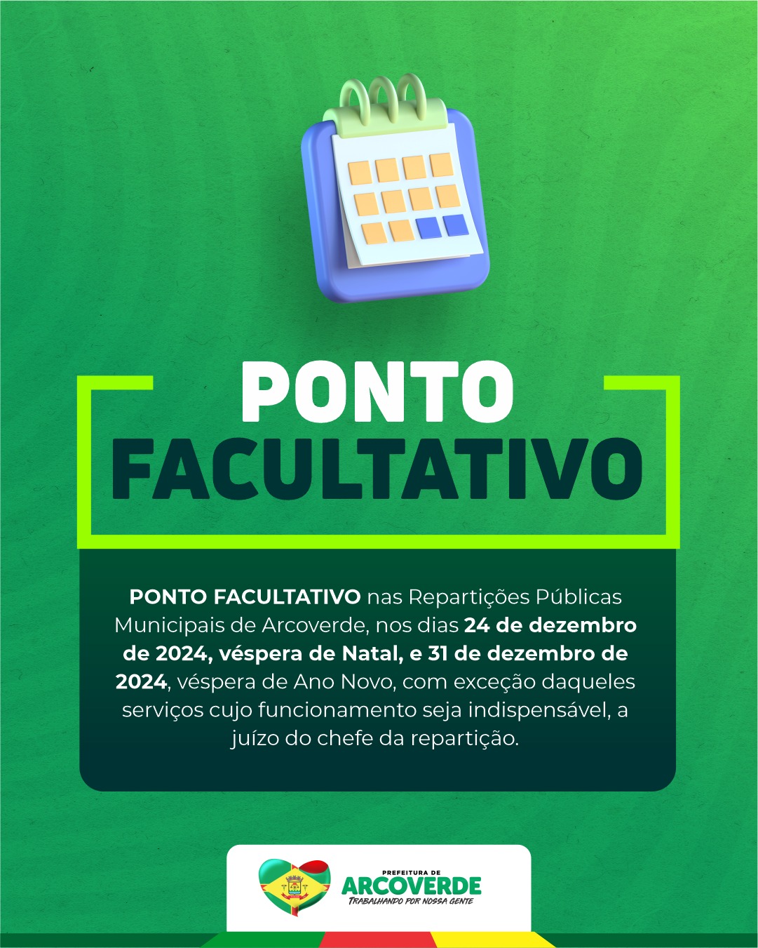 O Prefeito de Arcoverde, Wellington Maciel, no uso de suas atribuições legais, informa à população o Decreto n° 169/2024, referente aos pontos facultativos nos próximos dias 24 de dezembro (véspera de Natal) e 31 de dezembro (véspera de Ano Novo), para repartições públicas municipais.