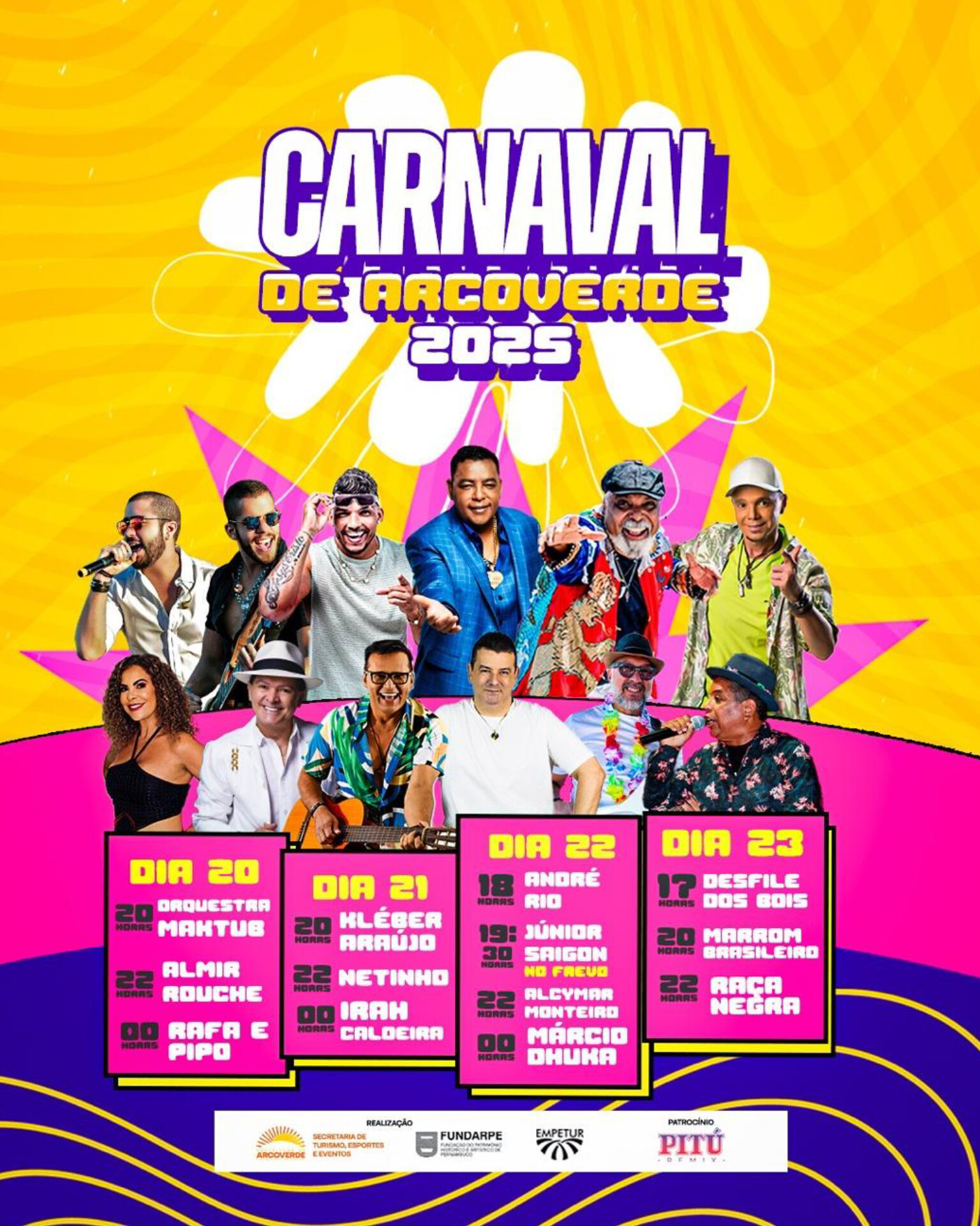 A partir de hoje, a energia deve esquentar ainda mais. Para compor o cardápio de atrações, neste sábado (22.02), a festa começa mais cedo. A partir das 18h, o pernambucano André Rio sobe ao palco. A noite também terá o arcoverdense Junior Saigon (19h30) e Alcymar Monteiro (22h). Quem vai fechar a terceira noite do Carnaval antecipado de Arcoverde será Márcio Dhuka, que canta a partir da meia-noite.