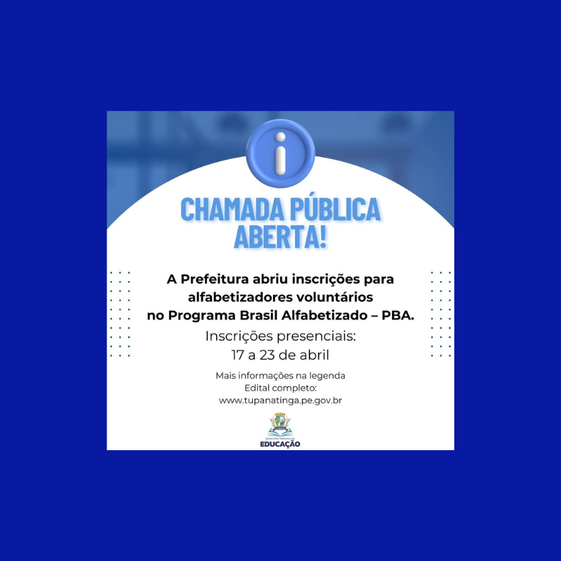 A Prefeitura Municipal de Tupanatinga, por meio da Secretaria municipal de Educação, tornou pública a seleção de professores voluntários alfabetizadores para atuarem no Programa Brasil Alfabetizado – PBA - Ciclo 2025.