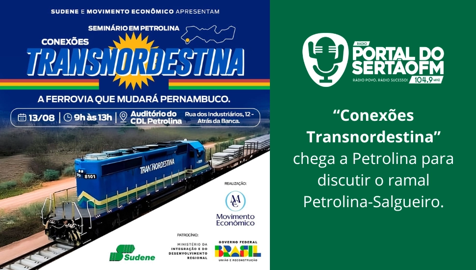 O seminário Conexões Transnordestina – A Ferrovia que Mudará Pernambuco, uma iniciativa conjunta do portal Movimento Econômico e Sudene, chega a Petrolina no próximo dia 13 de agosto, após sua estreia em Salgueiro, em 24 julho. O objetivo do seminário é fomentar o debate sobre os impactos econômicos e logísticos do ramal ferroviário Salgueiro–Suape, considerado um dos principais vetores de transformação regional nos próximos anos. O próximo evento será dia 15 de agosto, em Araripina.