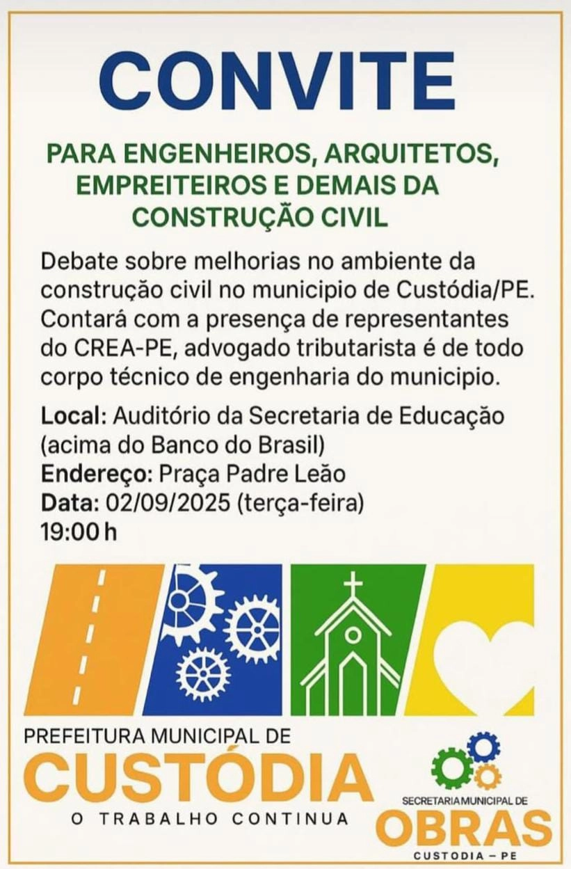 A Prefeitura Municipal de Custódia, em parceria com o Conselho Regional de Engenharia e Agronomia de Pernambuco (CREA-PE), realizará um debate para o aprimoramento do setor da construção civil no município.