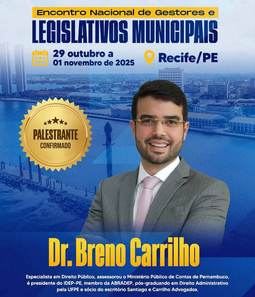 A presença do renomado jurista Dr. Breno Carrilho como palestrante é um mais um dos pontos altos do próximo Encontro Nacional de Gestores e Legislativos Municipais, que será realizado no Recife de 29 de outubro a 1º de novembro de 2025. Sua participação foi confirmada pela organização do evento, gerando grande expectativa entre os futuros participantes.